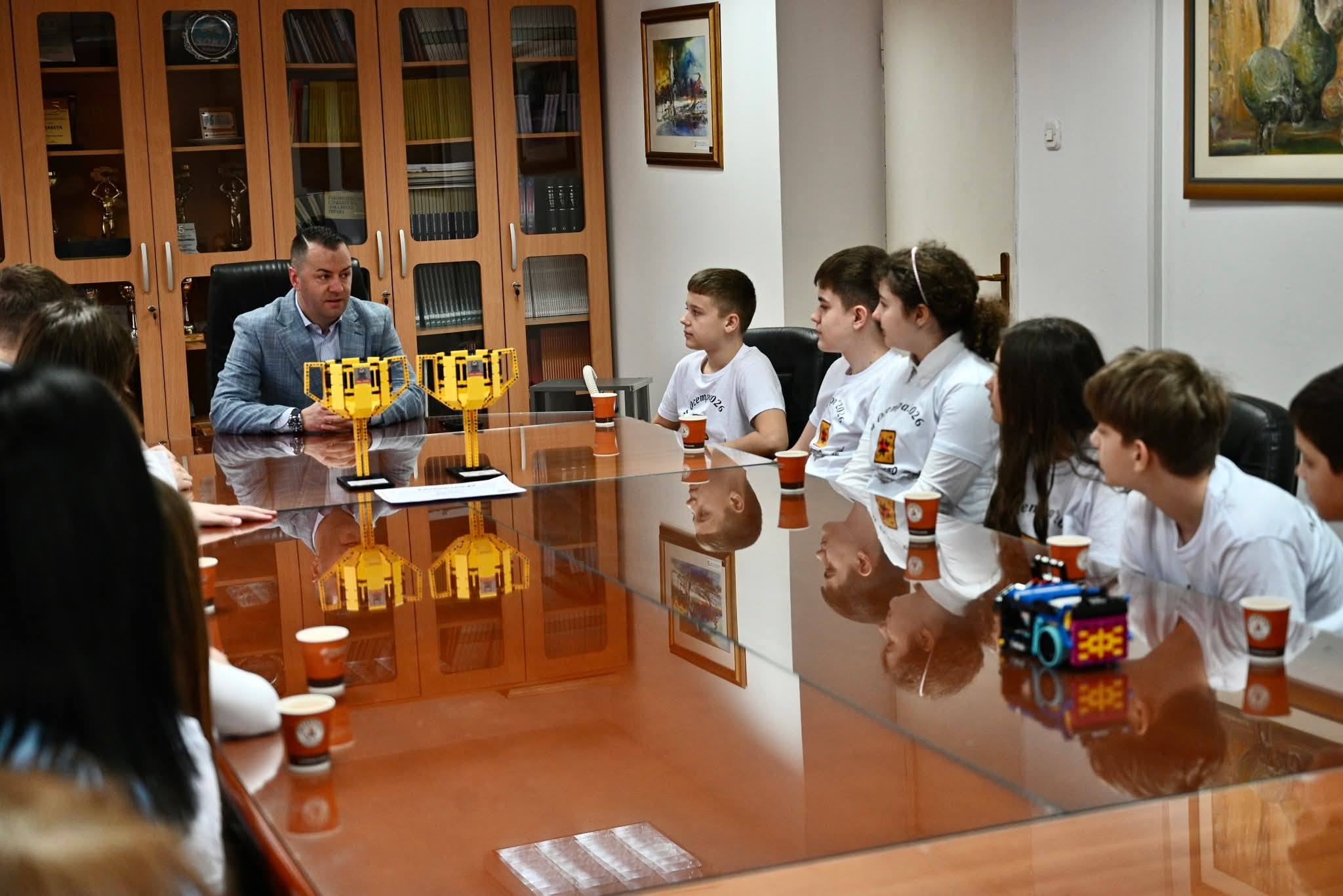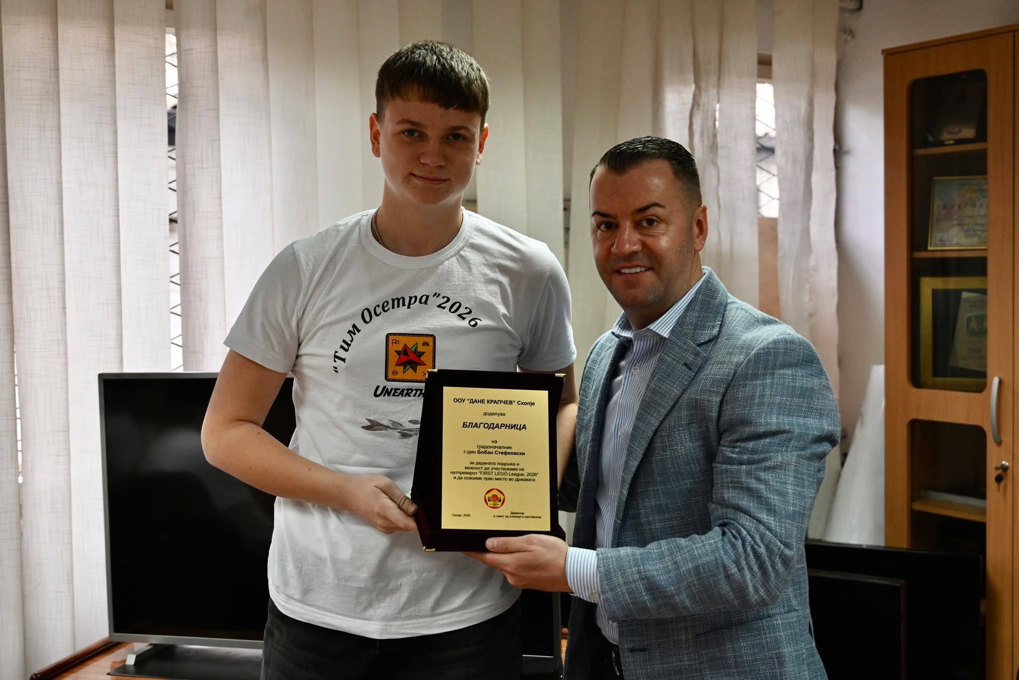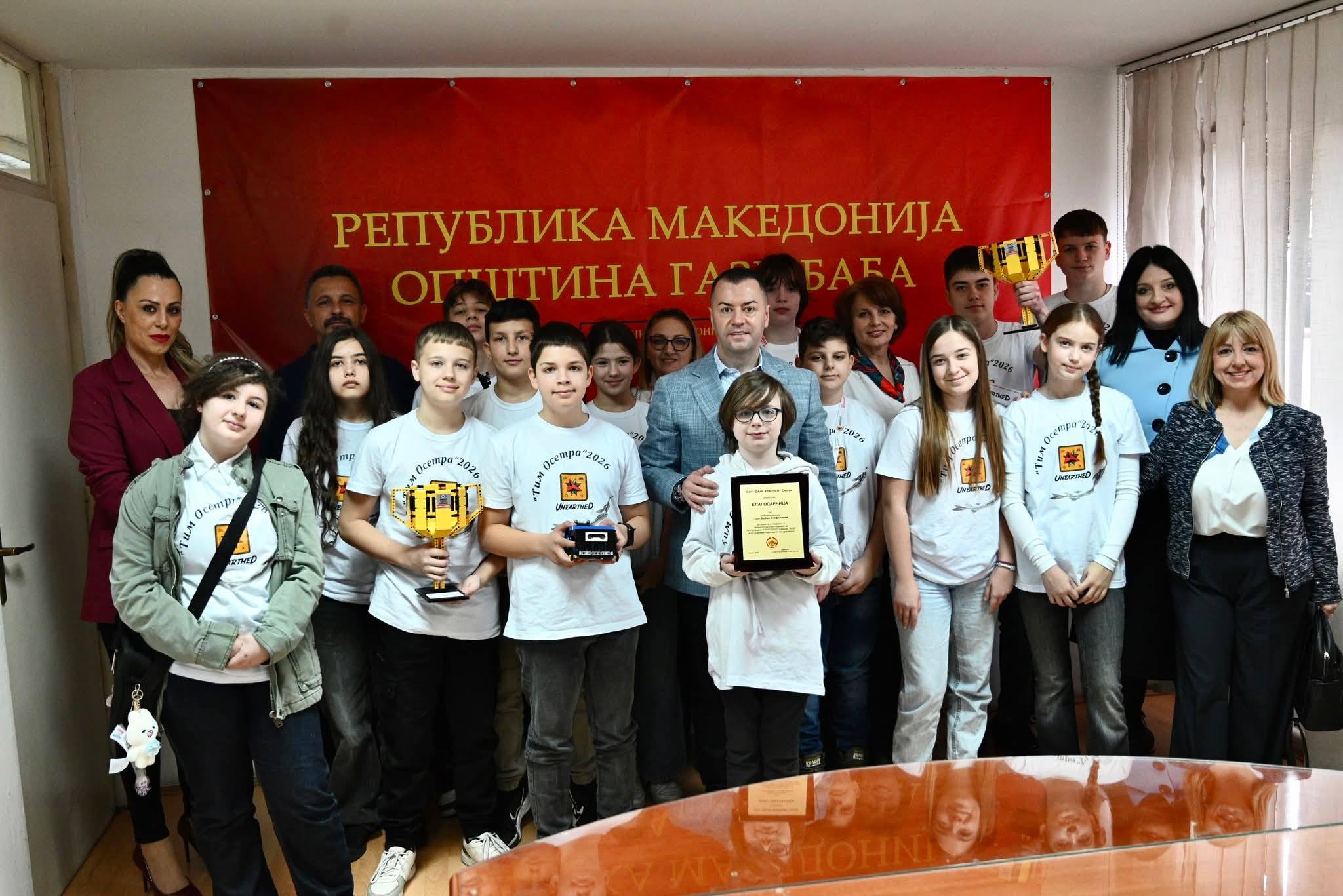 Градоначалникот Бобан Стефковски имаше средба ученици од ООУ „Дане Крапчев“ кои постигнаа извонреден и историски успех освојувајќи го првото место на Државниот натпревар „FIRST LEGO League 2026“, натпревар кој ги обединува најдобрите млади умови во областа на роботика, програмирање, наука, технологија, инженерство и математика.